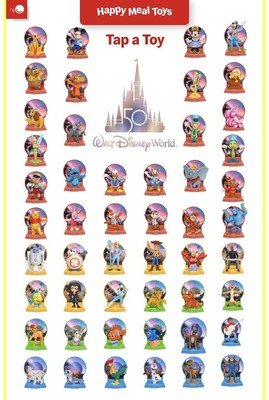 In celebration of 50 years of Walt Disney World McDonalds is featuring exclusive Disney character toys in its Happy Meals. Over 80 New. There are 50 toys and the characters mostly line up with those included in the Disney Fab 50 Character Collection.